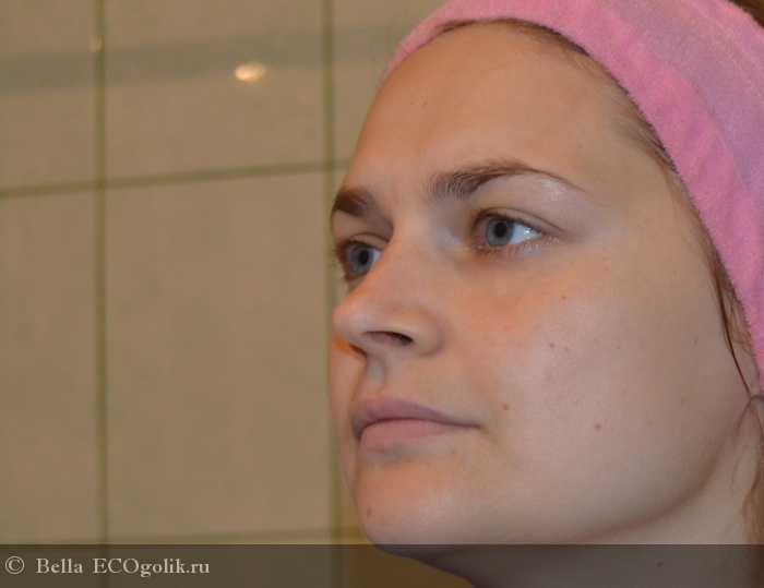Остатки маски тщательно смыла водой. Можно это делать руками, а можно с помощью спонжа коньяку. С последним по-моему удобнее. И вот результат!