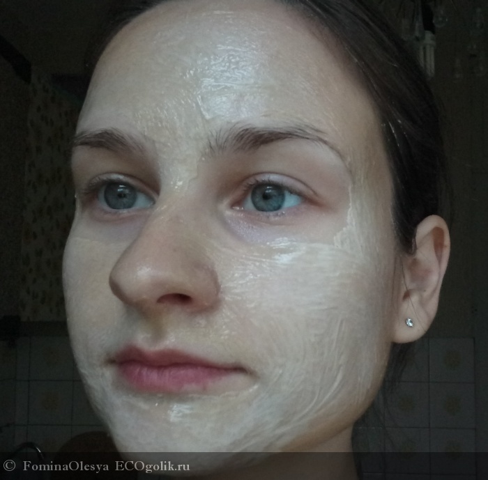 Данную маску производитель советует наносить на сухую, чистую кожу лица на 3-5 минут 1-2 раза в неделю. На ощупь маска довольно липкая, это довольно необычное и не совсем приятное ощущение, но к этой особенности очень быстро привыкаешь и перестаешь замечать. Я зачерпываю маску сухой, чистой ложкой, на все лицо мне достаточно одной чайной ложки без горки, маска очень экономичная. Далее наношу и распределяю ее по лицу пальцами, мне не очень нравится использовать для этого иные приспособления, но тут все на любителя.