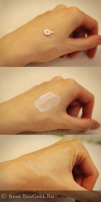 Крем имеет приятный запах (кстати, чем-то напомнил мне крем Био-годжи от Санте), нежную текстуру, наносить его приятно. Впитывается довольно быстро с тыльной стороны ладони, но на подушечках пальцев чувствую жирную пленочку.