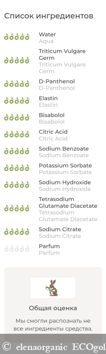 Aqua, Prunus Amygdalus, Triticum Vulgare Germ, D-Panthenol, Elastin, Bisabolol, Citric Acid, Sodium Benzoate, Potassium Sorbate, Sodium Hydroxide, Tetrasodium Glutamate Diacetate, Sodium Citrate, Parfum.