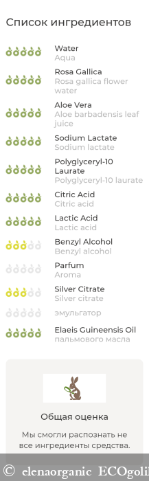 Aqua (вода дистиллированная), Rosa gallica flower water (гидролат розы), Рentylene glycol* (пентилен гликоль), Aloe barbadensis leaf juice (гель алоэ вера), Sodium lactate (лактат натрия), Polyglyceryl-10 laurate** (полиглицерил-10 лаурат), Citric acid (лимонная кислота), Lactic acid (молочная кислота), Benzyl alcohol (бензиловый спирт), Aroma (пищевой ароматизатор «Ваниль»), Silver citrate (цитрат серебра). * изготовлен из багассы, получаемой из сахарного тростника. **эмульгатор, полученный из жирных кислот кокосового и пальмового масла.