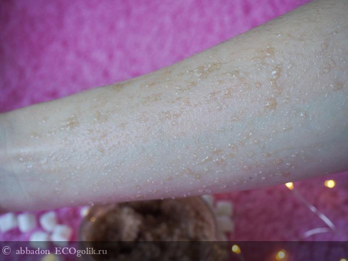 После процедуры я его смываю водой и как можете заметить на коже остались капельки воды, как будто на масляной коже. Я не чувствую ощущения жирности, лишь увлажнение и очищение и после того как вы оботрете тело полотенцем, эта масляная маска с кожи исчезнет сразу же. Но даже если этого не сделать, то оно все равно пропадает со временем, не оставляя каких либо неприятных ощущений.