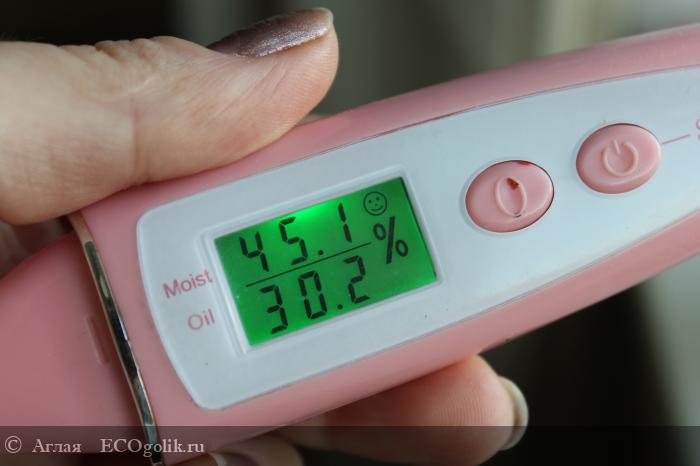 И дополню отзыв показаниями анализатора состояния кожи. Верхняя цифра это влага. Она у меня уже на хорошем уровне, но после патчей становится ещё лучше. И это не временный эффект.