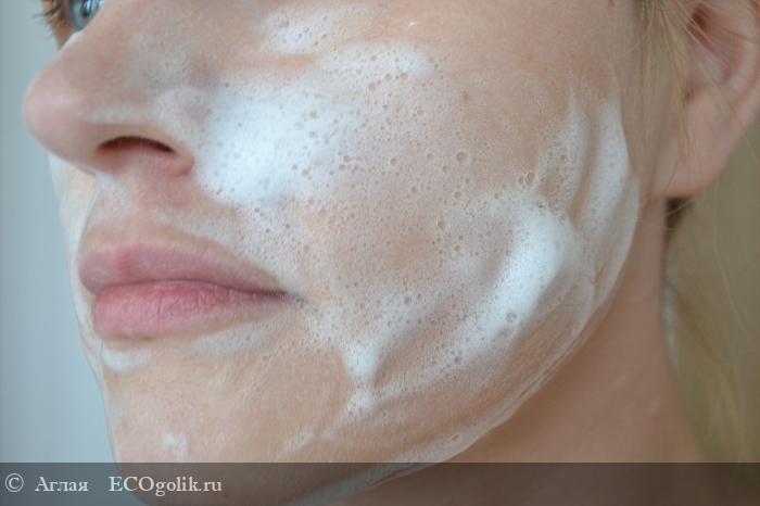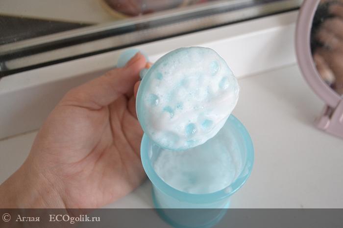 Гель ближе к жидкому, чем к густому по консистенции. Не смотря на натуральность мылящего вещества, пену дает приличную, даже если просто в бутылке поболтать. А уж если приложить к делу специальный вспениватель, то вообще можно многого добиться. У меня получилось вот столько пены после одного нажатия на дозатор и нескольких капелек воды. Пена нежная, воздушная, очень приятная для кожи.