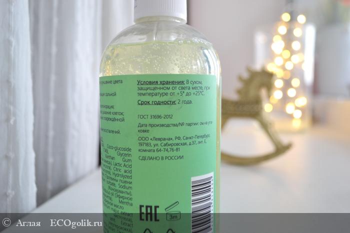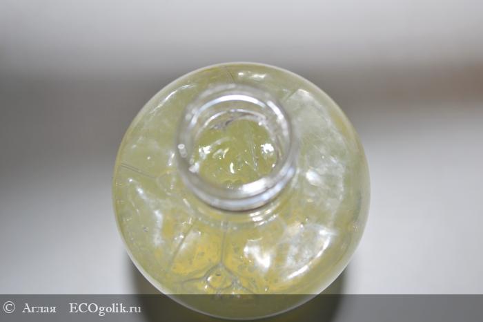 Через бутылочку прекрасно видно текстуру и цвет средства для лица. Оно прозрачное, с легчайшим натуральным оттенком зеленого цвета. Гель весь пронизан крупными пузырьками, к таким свойствам у Левраны я привыкла - все гелеобразные средства у нее пузырьковые и это прикольно)