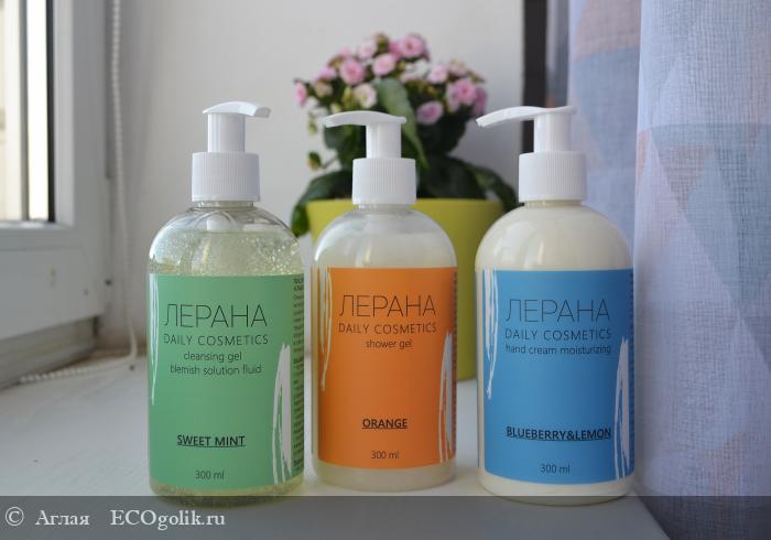 Фасуется косметика от Лераны пока что в одинакового формата пузырьки из пластика (который подлежит переработке, если что) объемом в 300 мл. Если с кремом спорно, т.к. с собой такой объем в сумочку не положишь, то с умывалкой и с гелем для душа формат что надо.
