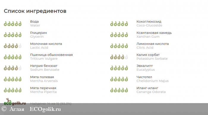 Проверку натуральности на Экоголике состав мятной умывалки прошел успешно. Отрицательных компонентов тут не нашлось. Не распознал он только один пункт- это Eleutherococcus sent Extract, но тут без вариантов - это растительный экстракт.