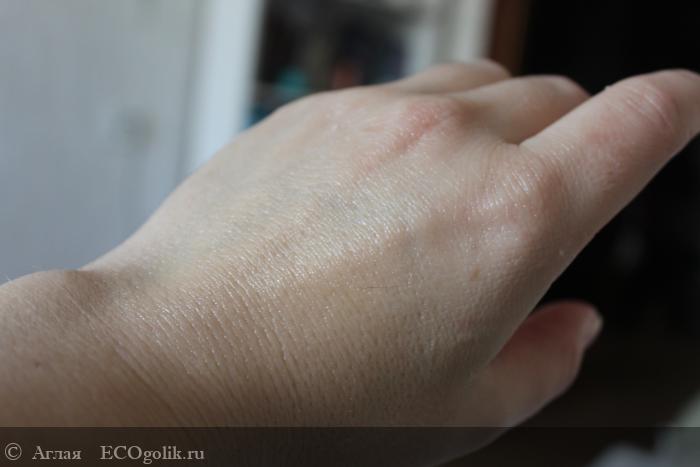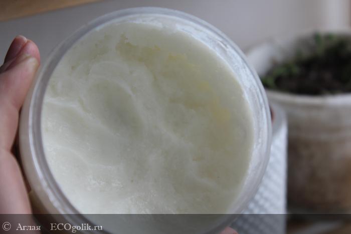 Крем весьма густой и плотный. Как видно на фото, белого цвета масляный и ароматный. Ощущается восковая составляющая. На коже он хорошо распределяется и тает от ее тепла.