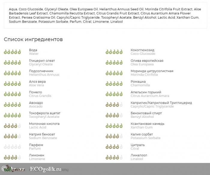 Полностью одобрен нашим сервисом проверки натуральности ингредиентов. Состав мне понятен. Я нашла там много полезных для своей кожи компонентов. Взять хотя бы алоэ, оливковое масло, молочную кислоту, авокадо. И, конечно же, сок фрукта нони (на скрине это моринда цитрусолистная).