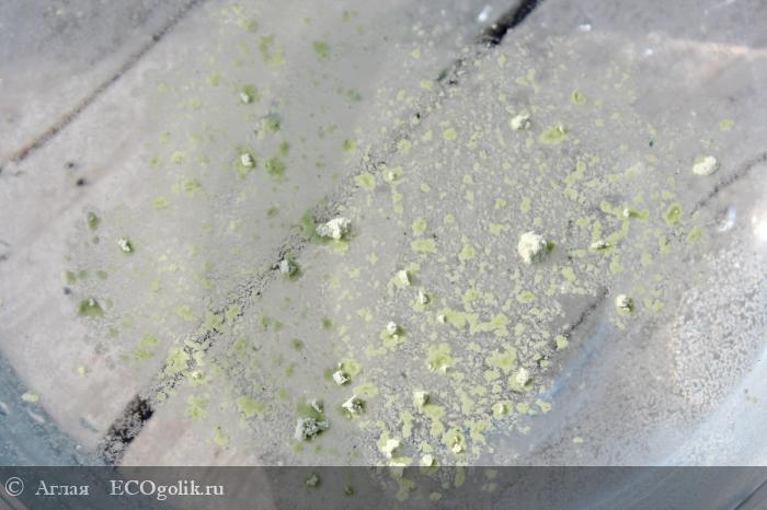 Вода от разведенной в ней вуали №502 равномерно окрашивается в едва заметный зеленый цвет. Она становится отчасти молочного качества, что напоминает мне Клеопатру и ее молочные ванны для сохранения молодости и красоты. Лежать в такой водичке очень приятно - ничего не отталкивает. Тут нет каких-то частичек, веточек, комочков. Растворение равномерное, если воду хорошо помешать руками. Пенности здесь нет никакой.