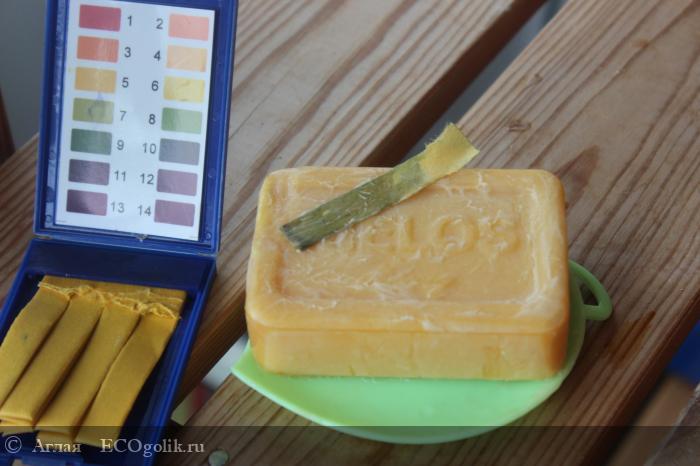 Я люблю тестировать продукцию не только по ощущениям, но и с помощью более точных подручных средств. У меня имеются PH-полоски, которые могут за секунду показать уровень PH любого косметического продукта. Что же показало мыло? Результат - 8-9. Это очень хороший показатель для любого мыла, т.r. это в принципе щелочной продукт и иметь PH 5.5 он не может.