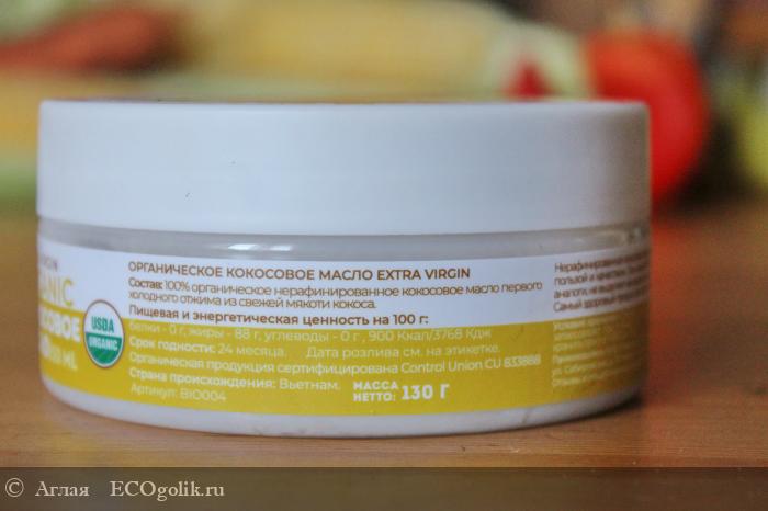 100% органическое нерафинированное кокосовое масло первого холодного отжима из свежей мякоти кокоса.