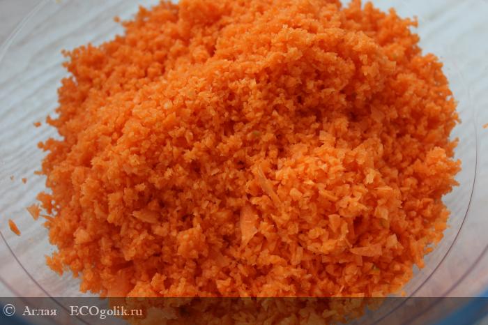 С помощью ножей и чаши я за минуту вот так измельчила морковь. Добавила специи, чеснок, муку и все перемешала руками. Тесто отлично формируется в котлетки, я их быстро наформировала и обжарила на сковороде с растопленным кокосовым маслицем.