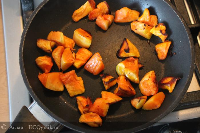 Пассирую на кокосовом нерафинированном кубики тыквы. Будьте аккуратны - она легко пригорает. Нужно довести ее до бронзовости и мягкости. Приправы и специи добавляем по своему усмотрению.