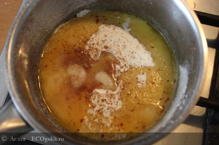 Топлю в кастрюле оба масла и, пока они топятся, натираю на мелкой тёрке мускатный орешек на свой вкус - люблю побольше, поскольку изюминка бешамеля для меня кроется в его отчётливом мускатном оттенке.