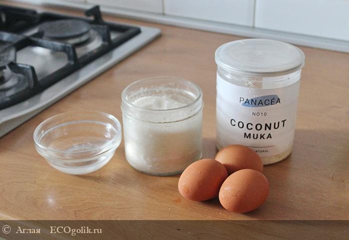 У меня в рецепте три яйца, 150 гр кокосовой муки, 50 гр кокосового масла, три чайных ложки сахара.