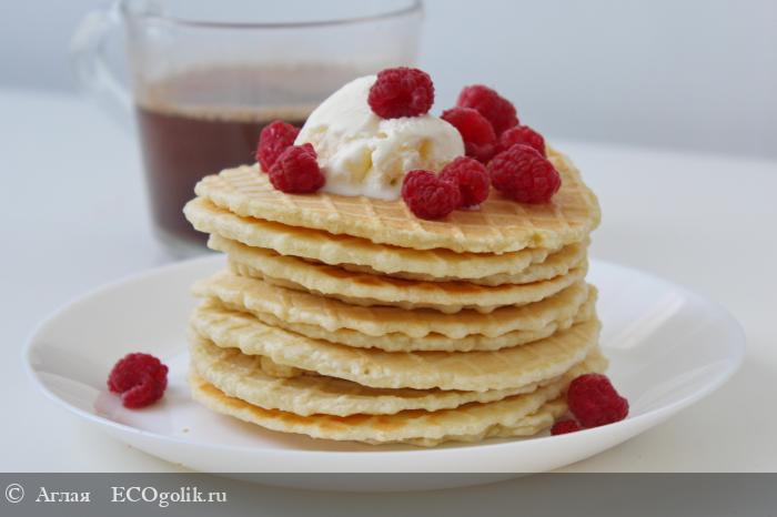 Вафельки в первые за долгое время получились у меня твердыми, не квелыми, с них не стекает масло, они очень вкусно пахнут. Просто красота! Подача на ваш вкус. У нас мороженое и ягоды) дети оторвали такие вафли с руками, еле успела сфотографировать, за кадром стояла толпа голодных галчат