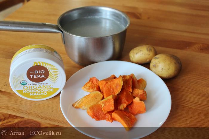 Понадобится куриный бульон, замороженная или свежая тыква, пара картофелин и кокосовое масло.