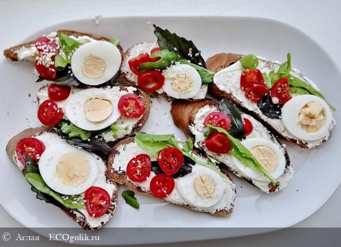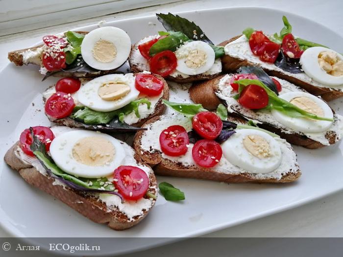 Дальше приступаю к сборке. Намазываю на брускетту творожный сыр с нейтральным вкусом, без добавок. Ну и дальше накладываю все, что было в холодильнике, - копченную рыбку, варённое яичко, помидоры черри, зелень, индейку. Вот один из вариантов получившихся брускетт, которые можно подавать и к праздничному столу.