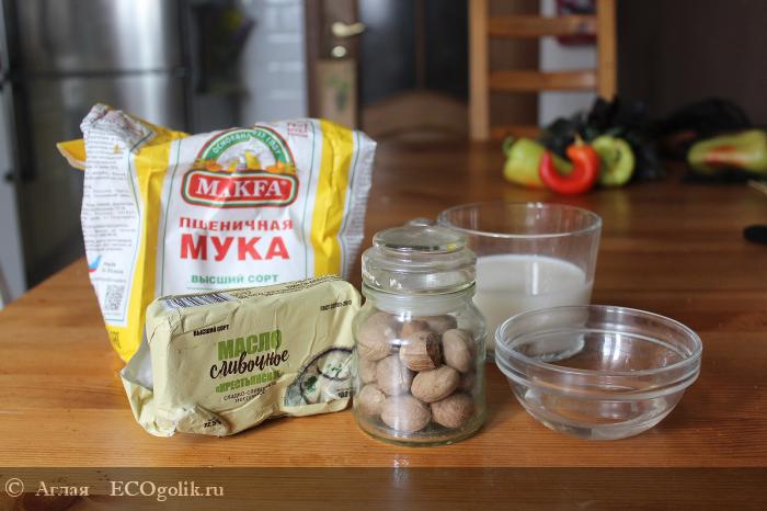 Для соуса бешамель мне понадобились 50 гр сливочного масла, 50 гр кокосового нерафинированного, мука (на глаз), мускатный орех, пол стакана молока.