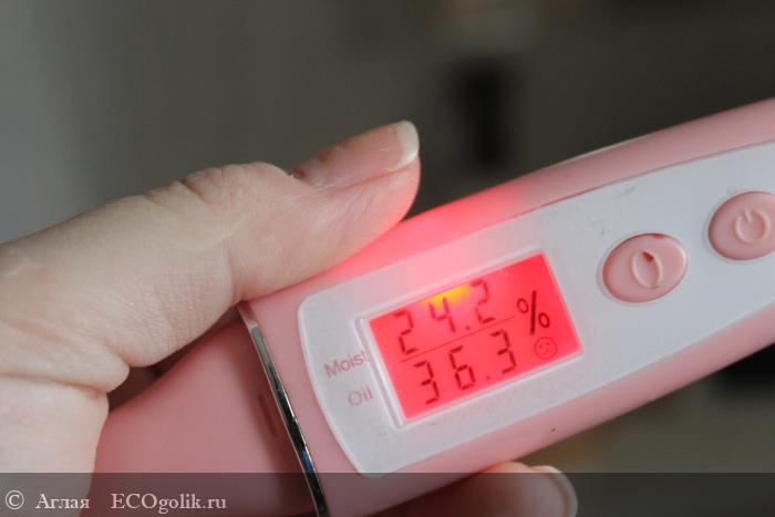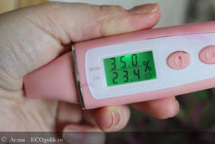 Итак, верхняя цифра это увлажненность участка кожи, нижняя - жирность/засаленность. Обычно я проверяю участок лба и скулы, потому что у меня комбинированный тип. Красный экран - норма для меня после умывания.