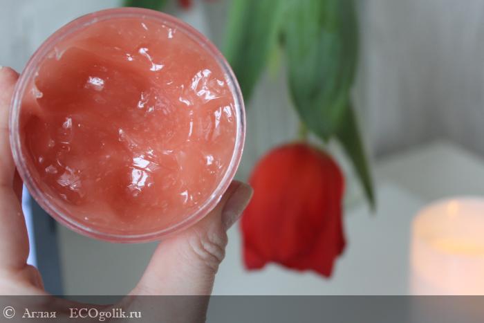 Массажный продукт находится в классической баночке-шайбе с прозрачными стенками. Выглядит, честно говоря, это все очень аппетитно, а когда крышку открываешь, то вообще это как полноценный десерт!