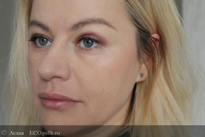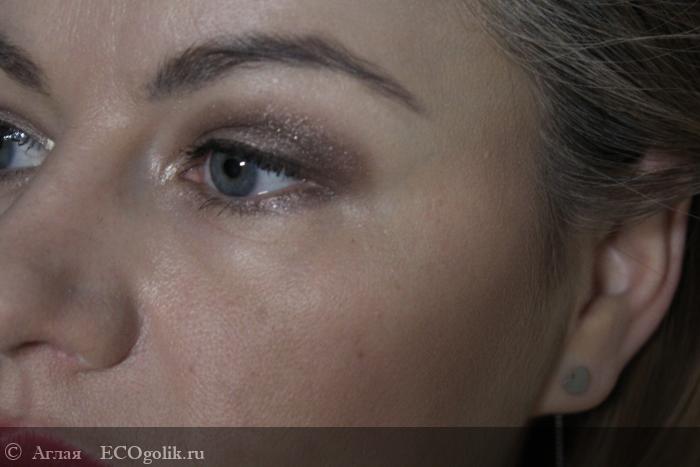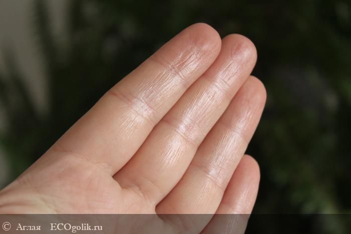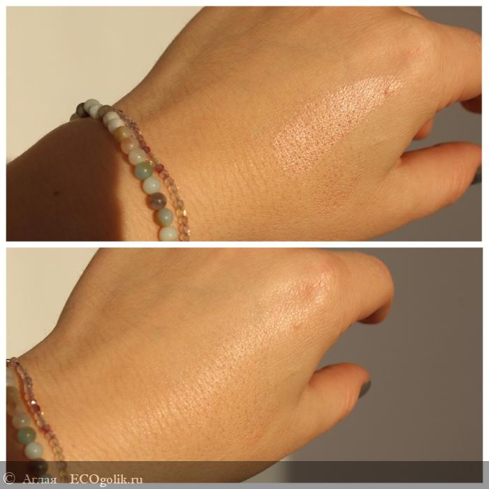 Текстура кожи подчеркивается, но без избытка. Никаких крупных блесток нигде в ненужных участках не наблюдается. Свечение кожи равномерное и деликатное, если хорошо растушевать и не пропустить нигде ни капельки крема. Из космоса ваш блеск не буден заметен, не с этим продуктом.