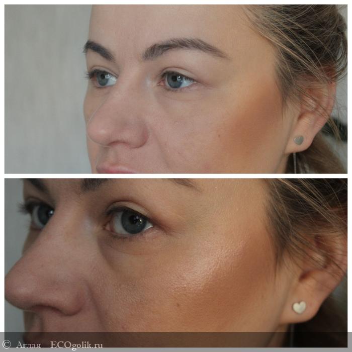 Что еще мне очень понравилось, это то, что эта декоративка успешно подстраивается под другие продукты для макияжа лица, такие, как румяна или скульптор. Ещё из важных моментом стоит отметить то, что хайлайтер не разъедает тон и другие продукты, которые были нанесены до него. Со скульптором: