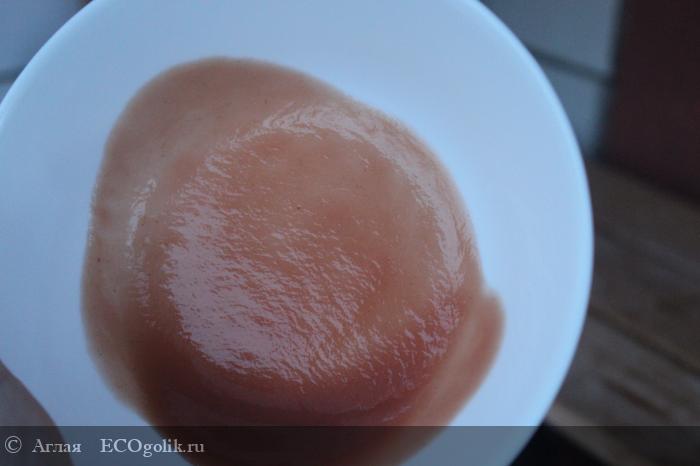 Имеет розовато-бежевый цвет. Дело в том, что здесь не чистая смородина, ее смесь с яблоком. Я не удивлена, поскольку ягоды смородины нужно очень много, чтобы наполнить каждую банку. Плюс сама она, без добавления сахара, будет, наверное, слишком кислой для ребенка. Поэтому ее вкус балансирует сладкое спелое яблочко