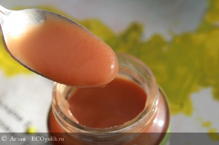 Консистенция однородная, никаких частичек и вкраплений нет, ребенку ближе к году я его уже давала. Текучесть позволяет как кормить ребенка с ложки, так и позволить есть ему самому. Все как и должно быть у хорошего детского питания из тертых фруктов.