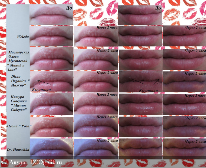 Фотографии бальзама на губах и бальзама на губах через 2-3 часа после нанесения( каждый бальзам тестировался, кружкой чая и вкусняшками...
