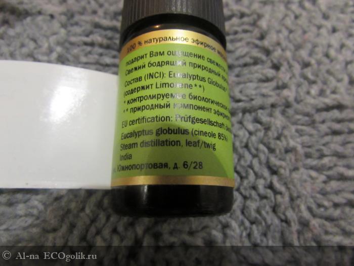 Также я применяю это эфирное масло в увлажнителе в том случае, если в квартире были посторонние люди (например, заходил курьер) - чтобы освежить помещение, ведь эвкалипт известен своей способностью очищать воздух. Так о нём и написано в каталоге Primavera: "Свежий камфороподобный аромат помогает дышать свободно в холодную пору года и очищает воздух в помещении".