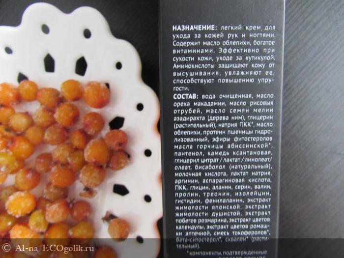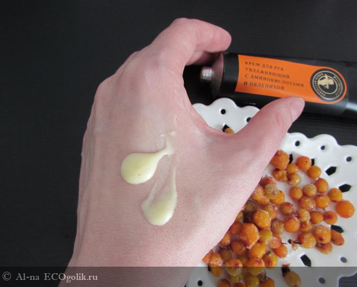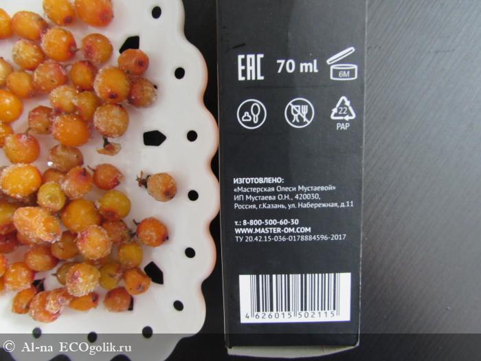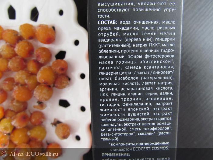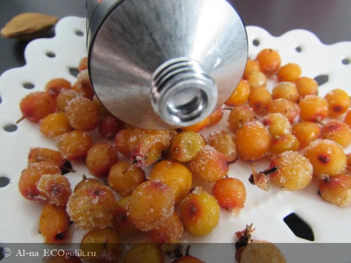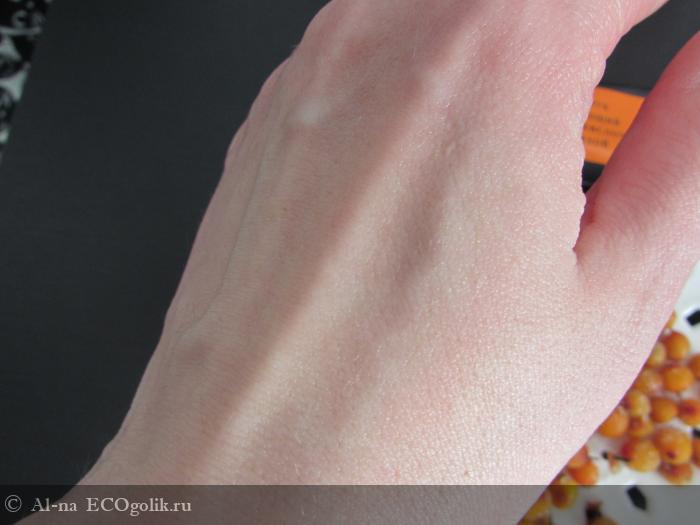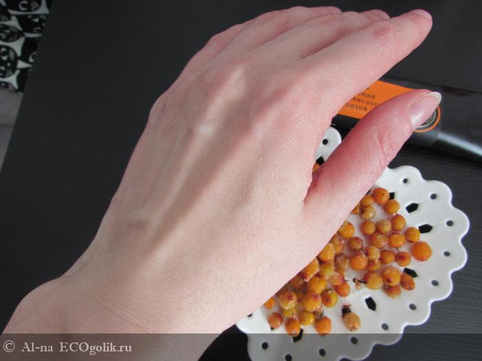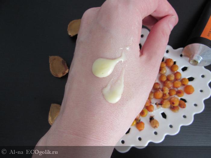 Аромат облепихи улавливается, но если прям поднести нос вплотную. Честно говоря, я ожидала более интенсивного аромата, учитывая, что масло облепихи стоит далеко не на последнем месте в составе.