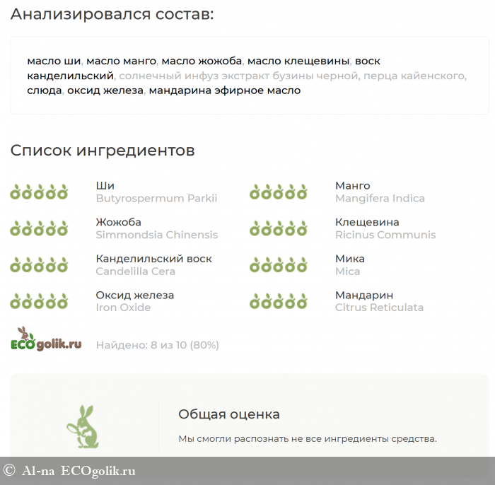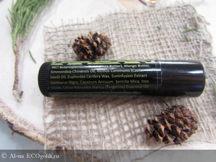 Состав: масло ши (карите)*, масло манго, масло жожоба*, масло клещевины, воск канделильский, солнечный инфуз экстракт бузины черной**, перца кайенского**, слюда, оксид железа, мандарина эфирное масло*.