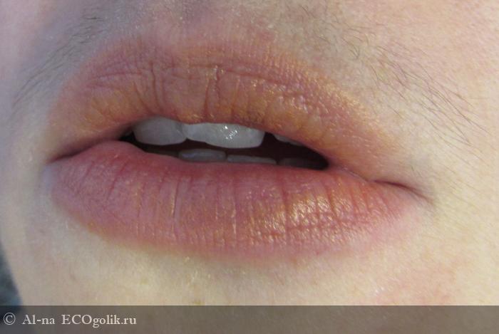 Если его нанести одним слоем, он практически незаметен. На губах появляется только едва заметное золотистое свечение.