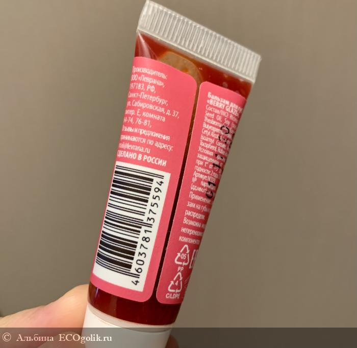 Ricinus Communis Seed Oil (Масло касторовое), Soy (soybean) wax (Воск соевый), Theobroma Cacao (Cocoa) Seed Butter (Масло какао), Butyrospermum Parkii Butter (Масло ши), Squalane (Сквалан), Cetyl Alcohol (Цетиловый спирт), Isoamyl Laurate (and) Isoamyl Cocoate (Растительный эмолент), Annatto (Краситель растительного происхождения), Aroma (Натуральная отдушка), Tocopherol (Витамин Е), Rubus idaeus L. extract (Экстракт малины).