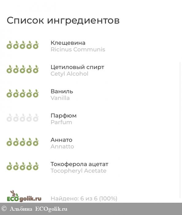 Ricinus Communis Seed Oil (Масло касторовое), Cetyl Alcohol (Цетиловый спирт), Vanillin (Натуральный ванилин), Aroma (Натуральная отдушка), Annatto (Краситель растительного происхождения), Tocopherol (Витамин Е).