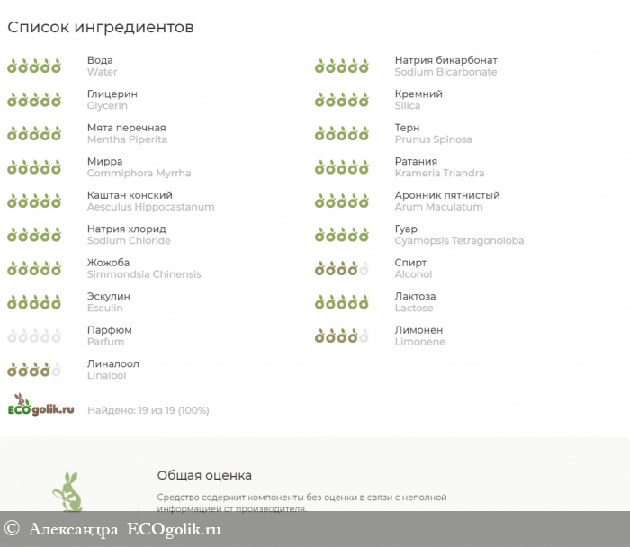 В составе очень много экстрактов с большим количеством дубильных веществ, что говорит о том, что паста идеальна при проблемах с деснами, любых воспалительных процессах во рту.