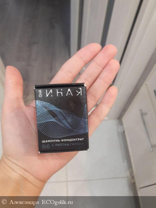 Но теперь мои впечатления о шампуне и результаты его применения. Сразу оговорюсь, что я приобрела еще кондиционер для волос и укрепляющий несмываемый крем для волос В6 + пептид гороха из серии "Она иня". Т.е. результат я получила от комплексного использования сразу нескольких средств серии. Сам шампунь сначала напугал меня своим миниатюрным размером (особенно по сравнению с его ценой