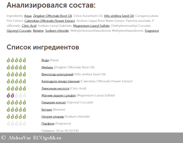 Теперь о составе. Сразу оправдаюсь, что на момент покупки я не сильно разбиралась в составах, и не знала об экоголик.ру. Была уверена в том, что если у шампуня такая супер-ЭКО упаковка, то и ингредиенты натуральные... Увы, это не показатель.
