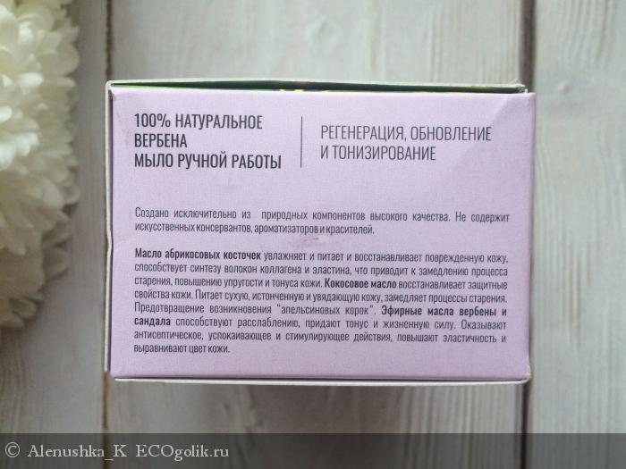 Пенится мыло хорошо: что в руках, что на мочалке (синтетической или конжаковой). Им приятно мыть как руки, так и тело. Аромат Вербены дарит дополнительный ароматерапевтический эффект.