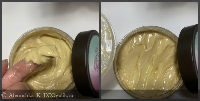 Консистенция бальзама - как у заварного крема. Если он некоторое время стоит не тронутым, то на поверхности проявляется масло, но ничего страшного, достаточно просто перемешать продукт - и консистенция восстановится.