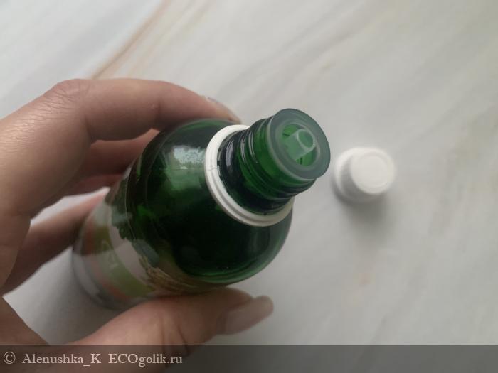 Масло находится в симпатичной бутылочке из зеленого стекла. Дозаторов - два вида. Продукт поставляется с капельным, но дополнительно прилагается дозатор-спрей (правда, им я не пользовалась). Бутылочку опоясывает красочная информационная этикетка, оформленная в стиле бренда: