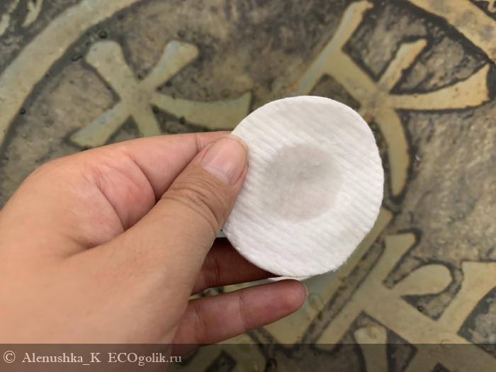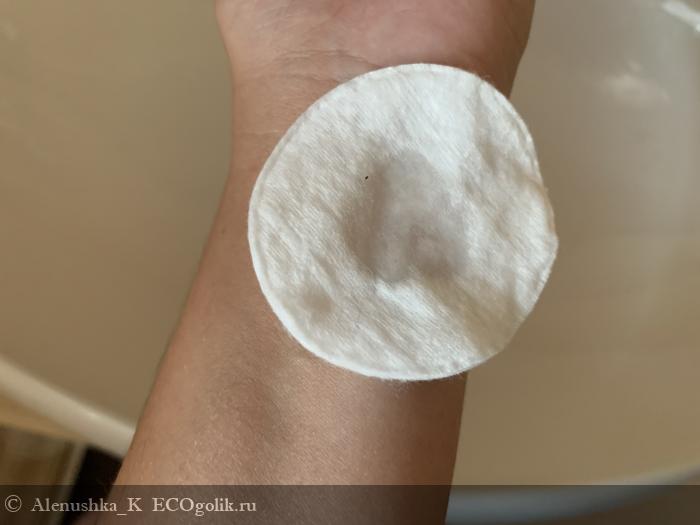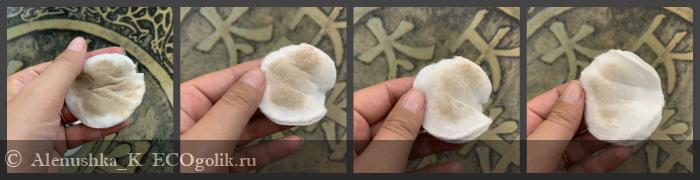 Я действовала по инструкции. В первый день ее использования на мне была следующая косметика : вв-крем, легкие тени, блеск для губ. К моему разочарованию, с полным удалением макияжа очищающая вода справилась (то есть ватный диск остался наконец чистым после протирания лица) только за 7 заходов. Подозреваю, что виною был именно ВВ. Я даже запечатлела несколько заходов на фото, на все не хватило терпения: