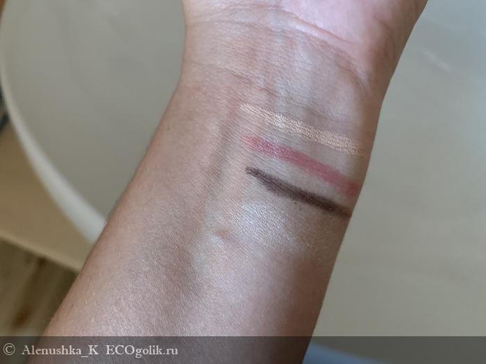 Продемонстрирую процесс на фото : сверху-вниз (натуральный маскирующий карандаш и бальзам для губ, далее химозные тени, и минеральный хайлайтер)
