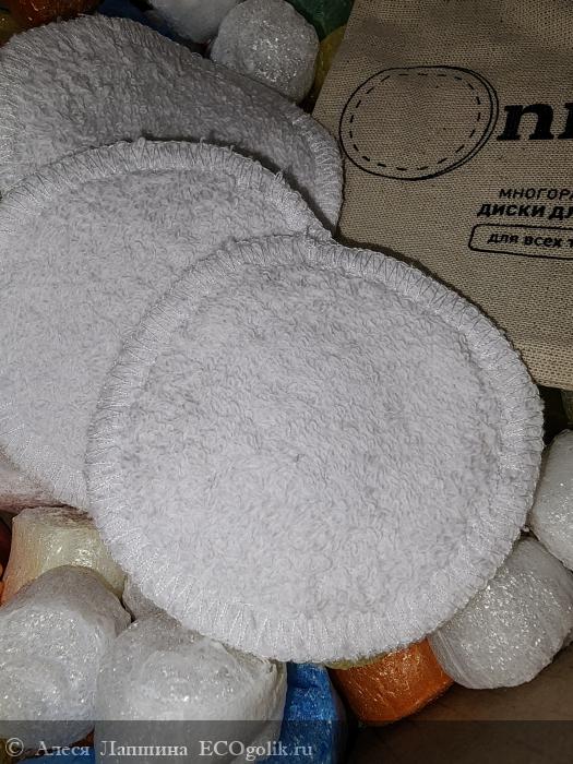 Я очень пекусь о сохранении нашей планеты и чтобы больше было товаров многоразовых. Такими дисками я чаще всего пользуюсь чтобы очистить лицо. Мне нравится их мягкость и прочность. Прямо на диск я наливаю мицеллярную воду или молочко для снятия макияжа и протираю лицо. После каждого использования я стираю диски. Сушу зимой я их на батарее, а летом прямо на улице, зацепив прищепкой к веревке. За счет натурального состава диски отлично отстирываются, хоть в прохладной (30 градусов), хоть в горячей (60) воде и не деформируются. С 1 стороны диски махровые,