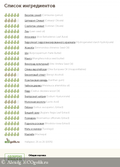 Centaurea cyanus floral water (Гидролат василька), Cetearyl Olivate (and) Sorbitan Olivate (Растительный эмульгатор), Olea Europ. Fruit Oil (Масло оливковое), Leen seed oil (Масло льняное), Aloe Barbadensis Leaf Juice* (Алоэ вера сок), Hydragenated starch hydrolysate (Растительный сорбитол), Simmondsia chinensis Seed Oil (Масло жожоба), Butyrospermum Parkii Butter (Масло ши), Mangifera indica seed butter (Масло манго), Vitis Vinifera Seed Oil (Масло виноградной кост.), Hydrogenated Olive Oil (and) Olea Europaea (Olive) Fruit Oil (and) Olea Europ. (Olive) Oil Unsaponifiables (Растительный со-эмульгатор), Benzyl Alcohol (Бензиловый спирт), Xanthan gum (Ксантановая камедь), Melaleuca alternifolia oil (Эфирное масло чайного дерева), Cedrus deodara wood Oil (Эфирное масло кедра), Sodium Hyaluronate (Гиалуронат), Lactic Acid (Молочная кислота), Sorbus aucuparia L. Extract (Экстракт рябины), Juglans Regia Leaf Extract (Экстракт грецкого ореха), Rosmarinus officinalis Extract (Экстракт розмарина), Rhodiola rosea L. Extract (Экстракт родиолы), Tussilago farfara L. Extract (Экстракт мать-и-мачехи), Macleya microcarpa (Maxim.) Fedde. Extract (Экстракт маклейи).