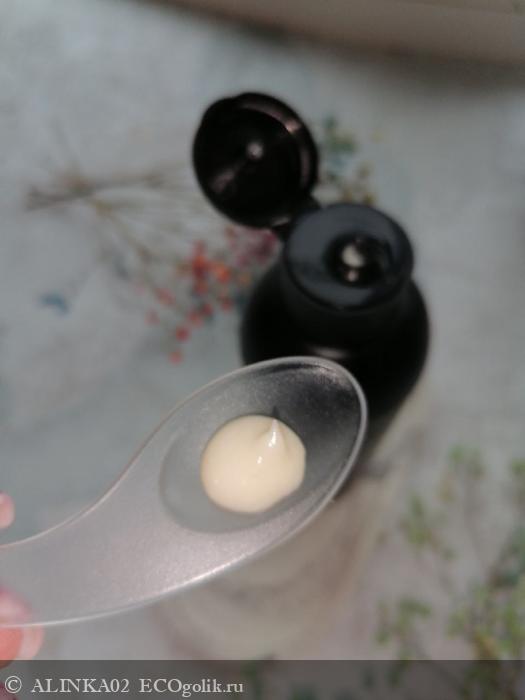 Кондиционер по консистенции жидкий, похоже на кремовую текстуру, желтоватый оттенок. Приятный аромат наполняет помещение в ванной.