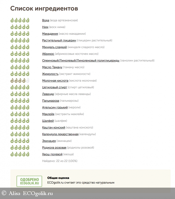 вода артезианская, воск нима, масло макадамии, глицерин растительный, миндаля сладкого масло, абрикосовых косточек масло, ланолин растительный, таману масло, экстракт жимолости, кислота молочная, спирт цетиловый, эфирные масла лаванды, пальмарозы, шалфея, нероли, экстракты маклейи, шалфея, каштана конского, календулы, эхинацеи, родиолы розовой, хвоща.