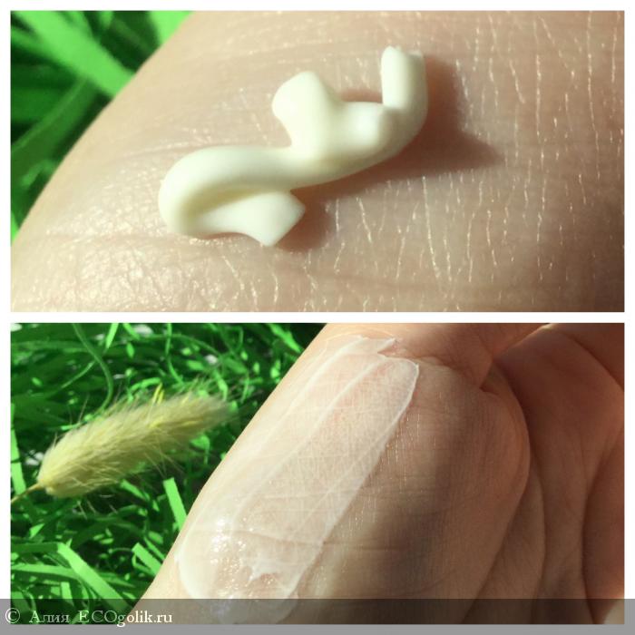 Крем белого цвета. По консистенции довольно плотная — я ожидала от эмульсии более легкую. Распределяется по коже легко.
